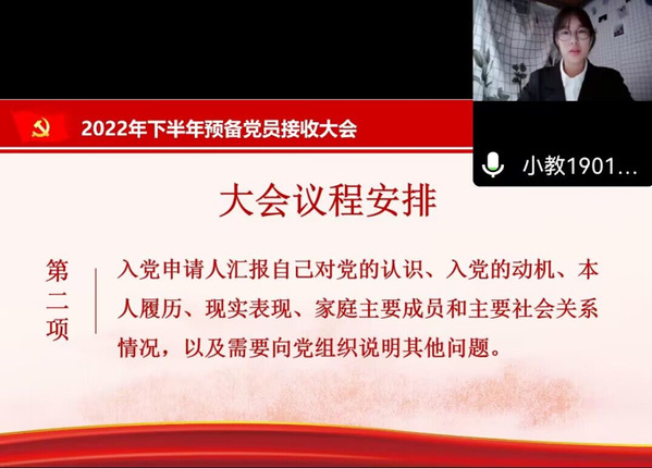 11月13日晚19:30,bwin必赢在线登入学生第二党支部在腾讯会议召开2022年下半年预备党员接收大会。bwin必赢在线登入党委副书记王永胜、学生第三党支部书记邹焱萍、学生第二党支部书记陈俊芳、支委沈胜林出席本次会议,学生第二党支部学生党员及发展对象李美格参加会议。本次会议由学生第三党支部书记邹焱萍主持。