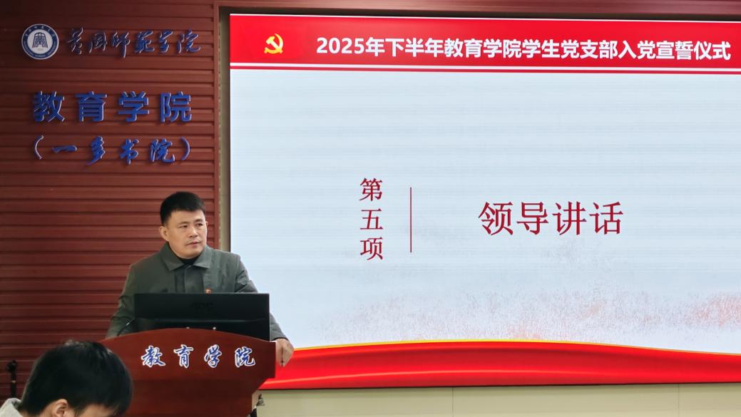 学院党委书记钟劲松讲话。他对新党员提出三点希望与要求:一是胸怀高远格局,立足长远发展,摒弃功利化的短视考量;二是锤炼过硬专业本领,以创新实干为国家发展和社会进步创造价值;三是坚持终身学习,以学习促成长,在新征程上坚定党员信念、擦亮先锋底色,书写青年党员的责任与担当。