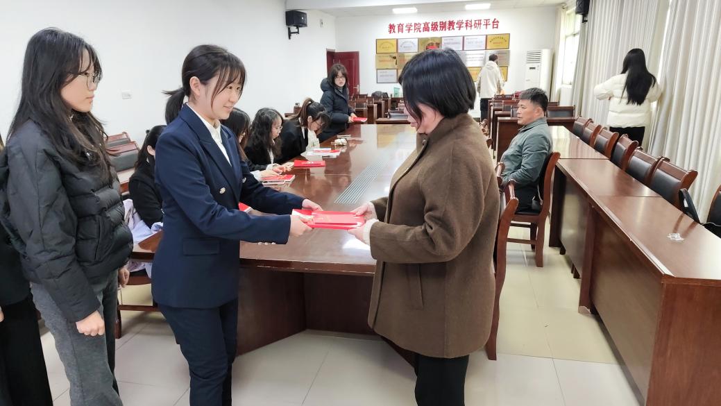 徐丹逐一向新党员发放《党章》、党徽以及党员手册。