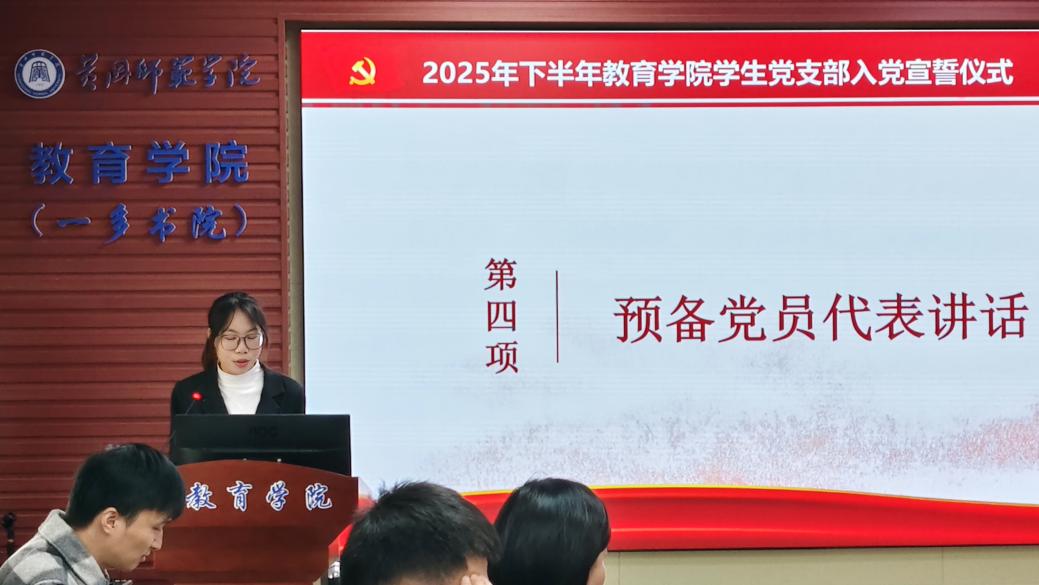 新党员代表张思琪发言。她讲述了个人成长经历、感谢了党组织的关心培养,然后代表新党员郑重表态,必将:铭记誓言,筑牢信仰;勤学本领,立德树人;严守纪律,锤炼党性;甘于奉献,服务师生,以实际行动践行党员使命。