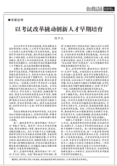 近日,黄冈师范学院二级教授、湖北基础教育研究院副院长、bwin必赢在线登入(一多书院)陈中文的咨询报告《以考试改革撬动创新人才早期培育》正式被湖北省教育厅采纳应用,相关核心建议以刊首语形式刊发于《湖北招生考试》2025年12月第36期(总第780期),为我省基础教育阶段创新人才早期培育提供了重要实践指引。