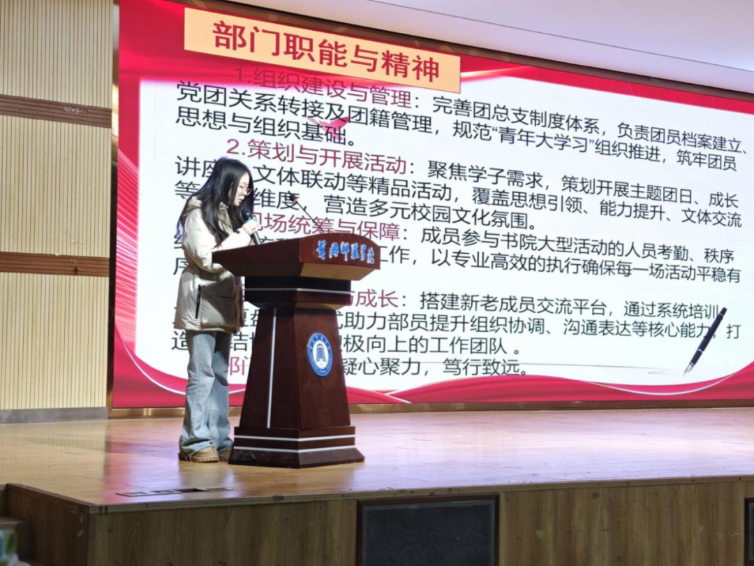 会议首先进行了团委、学生会各部门(中心)及主持队的年度工作总结汇报。办公室(综合事务部)、组织部、宣传部、第二课堂中心、社团管理中心、青年实践中心、青年艺体中心、权益保障部、学习科创部、心理健康部、纪检部及主持队负责人依次上台,围绕本年度工作开展情况、取得成果与不足反思进行汇报。各部门汇报内容扎实、条理清晰,全面展现了一学年来团学组织在各项工作中的积极作为与持续进步。